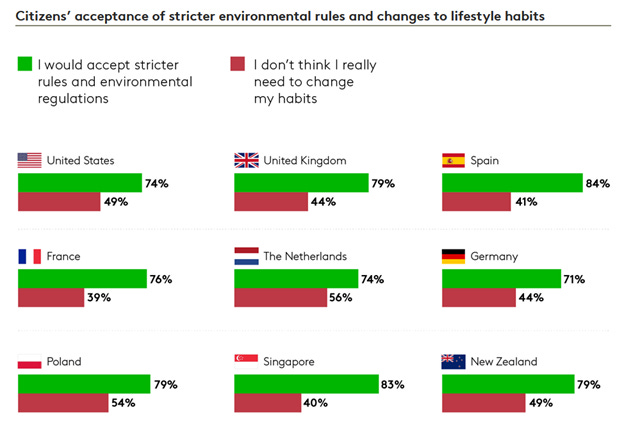 In these 9 rich countries, three-quarters of people believed more environmental regulations were important but almost half felt there was no real need for them to change their personal habits, and only a fifth thought it necessary for people to fly less or reduce their meat consumption.