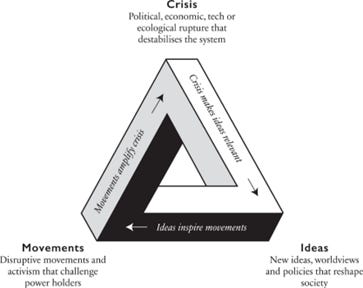 “rapid, transformative change is most likely to happen when a Crisis occurs in conjunction with disruptive Movements and visionary new Ideas permeating society. None of them alone is sufficient.” (source: History for the Future)