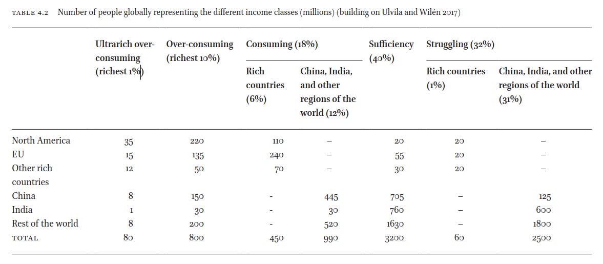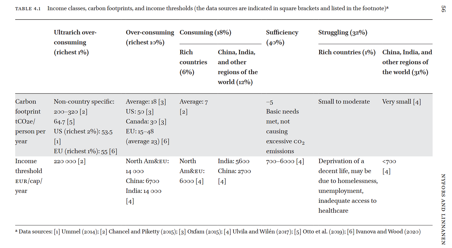 Direct quotes from the chapter: The ultrarich overconsuming class constitutes the richest 1% of the world population, with annual incomes above 220 000 Euros. The carbon footprints are estimated to be in the range of 200—320 tCO2e/capita per year. The overconsuming class is the richest 10% of the world population, living predominantly in North America and the EU, with incomes above 14 000 Euros. This class has average footprints around 20 tCO2e/capita per year. The consuming class constitutes almost a fifth of the global population. Incomes in the EU, North America, and other rich countries range from 6000 to 14 000 Euros. The carbon footprint of the consuming class is around 7 tCO2e/capita per year, close to the global average. The sufficiency class includes about one third of the human population. It refers to individuals with carbon footprints of up to 5 tCO2e/capita per year. This shifts attention from North America and the EU to lower-income regions. The vast majority of people in this class lives in developing or rapidly growing economies. The struggling class refers to a third of the global population that does not have its basic needs met, lacking essentials like safe and sufficient food, water, and shelter. The struggling class includes the poorest individuals, mainly living in sub-Saharan Africa, where 70% of the population belongs to this class. The struggling class is largest in developing countries. The 10% with the lowest income have carbon footprints around 0.1 tCO2e/capita per year and include countries like Honduras, Mozambique, Rwanda, and Malawi. Their footprints are 2000 times lower than that of top emitters. More than a billion of the poorest people have a purchasing power parity of less than USD 1.90 per day, with carbon footprints up to 1.9 tCO2e/capita per year.